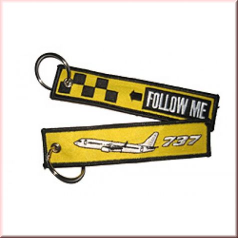Gewebter, widerstandsfähiger Polyester-Textilanhänger im original "Follow Me"-Design. Rückseite: Boeing 737. Alle Anhänger werden mit montiertem Schlüsselring ausgeliefert. Abmessungen: ca. 12,5cm x 2,5cm